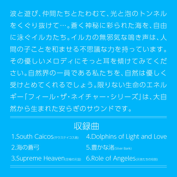イルカの声を散りばめ大海原をイメージした音楽と合わせた、ヒーリング効果の高い一枚です。