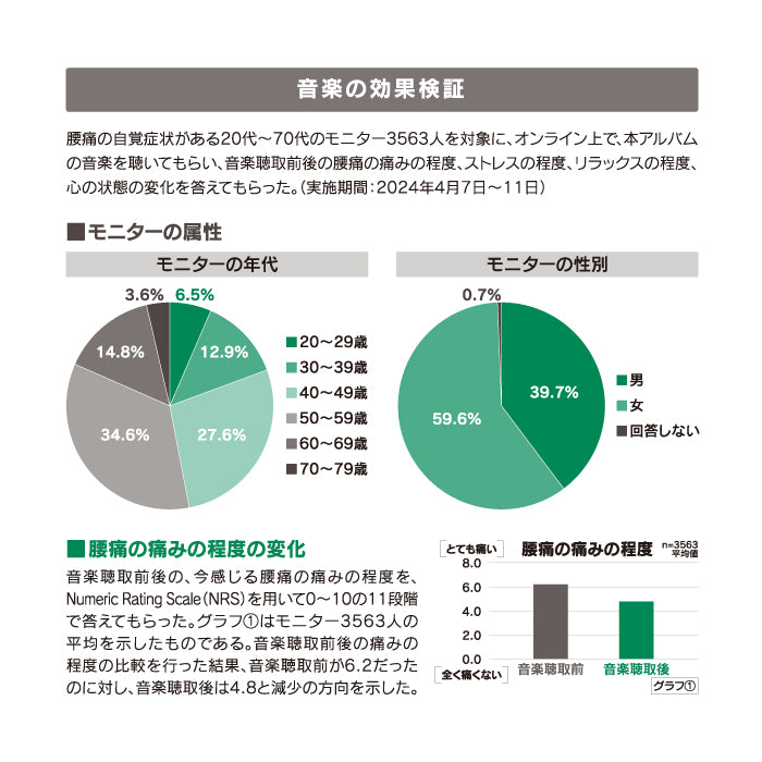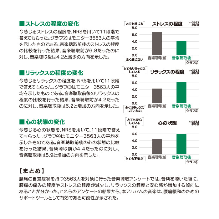 腰痛の症状を抱える3563人に行った音楽聴取アンケートでは、音楽を聴いた後は、聴く前よりも痛みの程度、ストレスの程度、リラックスの程度、心の状態のいずれも改善の方向を示すことが分かりました。