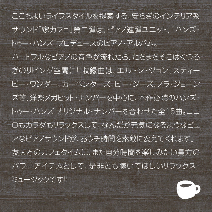 ここちよいライフスタイルを提案する、安らぎのインテリア系サウンド「家カフェ」第二弾は、ピアノ連弾ユニット、“ハンズ・トゥー・ハンズ”プロデュースのピアノ・アルバム。