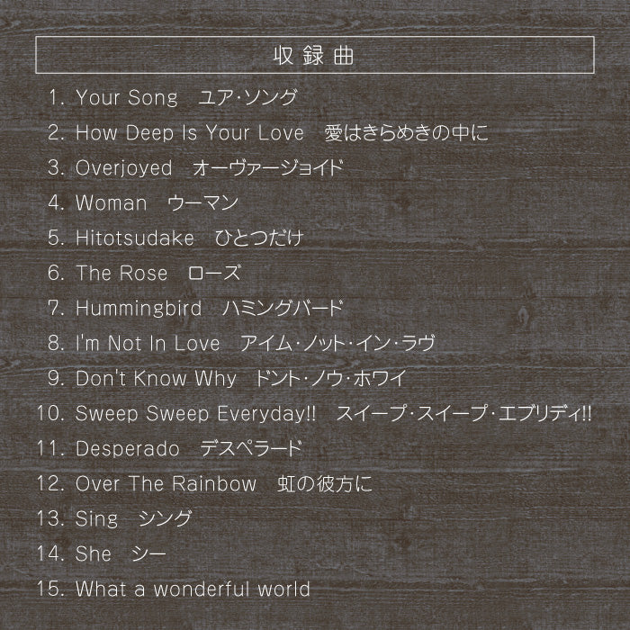 収録曲は、エルトン・ジョン、スティービー・ワンダー、カーペンターズ、ビー・ジーズ、ノラ・ジョーンズ等、洋楽メガヒット・ナンバーを中心に、本作必聴のハンズ・トゥー・ハンズ オリジナル・ナンバーを合わせた全15曲。