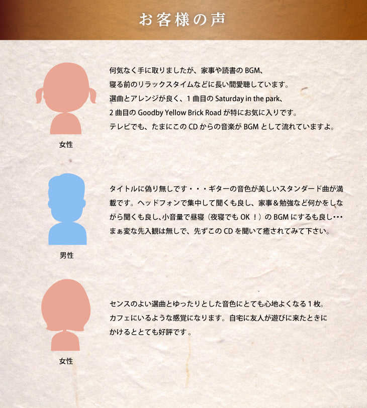 アレンジは温もりあふれるアコースティック・ギターを中心としたコンボで、いつどこで聴いても和めるスロー・ミュージックのヒット・カヴァー集です。
