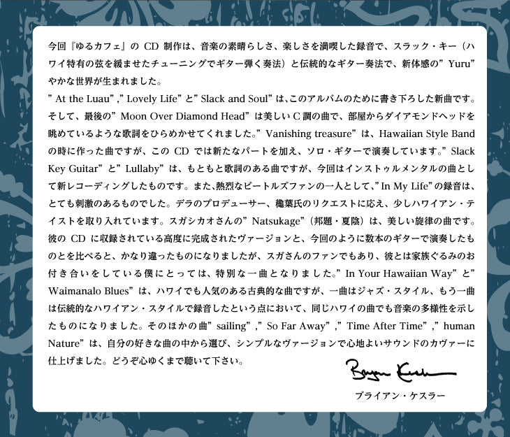 ハワイ伝統のチューニング、スラック・キー(弦をゆるめた奏法)で奏でられるギターのメロディーは、心地よいハワイの風を呼びよせ、芳しい楽園の花々を想わせ、そしてゆるやかなハワイアン・タイムへと私たちをいざなってくれる・・・。