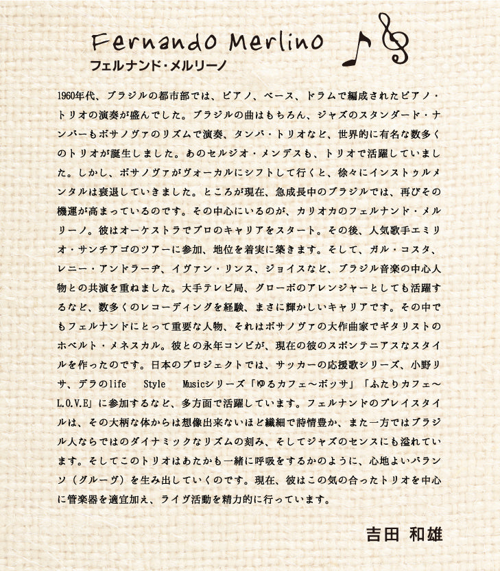 かねてよりブラジルのミュージックシーンで活躍するピアニスト、フェルナンド・メルリーノ率いるピアノ・トリオの息のあった演奏と、ゲスト・ミュージシャンによるサックスやギターが加わり、よりメロウで心地よい仕上がりに。