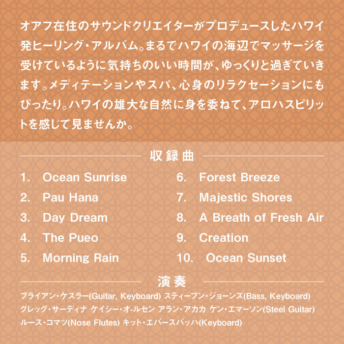 本場ハワイの自然音(波・小鳥のさえずり・せせらぎ)とスラッキー、ベース、ウクレレ、ノーズ・フルートなどのアコースティック・サウンドを合わせた、ゆるみ度抜群のハワイ発ヒーリング・アルバム。