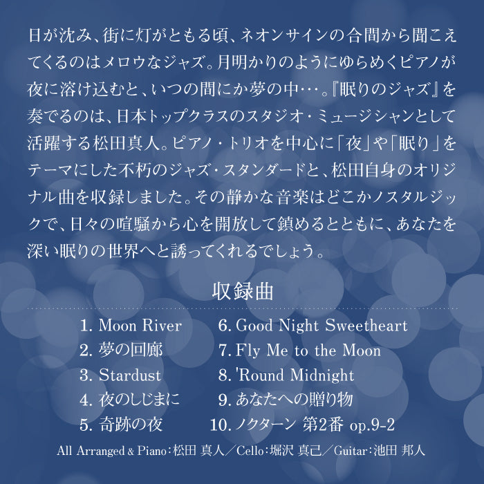 ピアノをメインに「夜」や「眠り」をテーマにした本作は、日本トップクラスのスタジオ・ミュージシャンでもある松田真人のピアノ・トリオを中心に奏でる不朽のジャズ・スタンダードと、松田自身のオリジナル曲を収録。