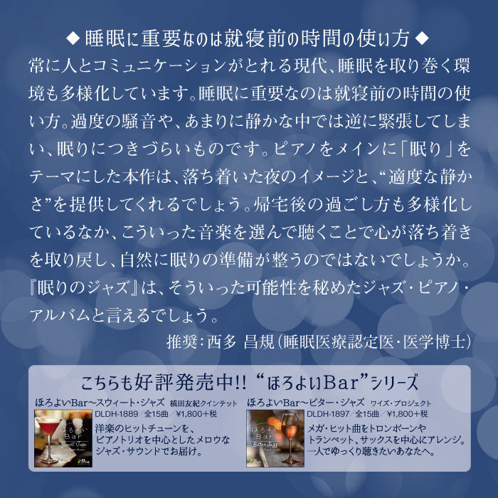 眠りに誘うことを一番の目的として作られているようですが、とんでもない!純粋に音楽としても楽しめるアルバムです!極力、音数を抑えた静かな、そして心地良く分かりやすいピアノ・ジャズと言ったら良いでしょうか。有名なスタンダードとバラエティに富んだオリジナルが合計で10曲収録されていて、このアルバムは買って正解でした!都会的な感じのサウンドなので、大人の雰囲気の落ちついたセンスの良い空間を醸し出す音源としても利用出来ると思います。食事を食べながら、友達とお喋りをしながら、疲れている時にも、そして仕事をしている時のBGMとしても良いのではないかと思います。色々な状況で使えそうなので、これから十分に活用させて貰います!