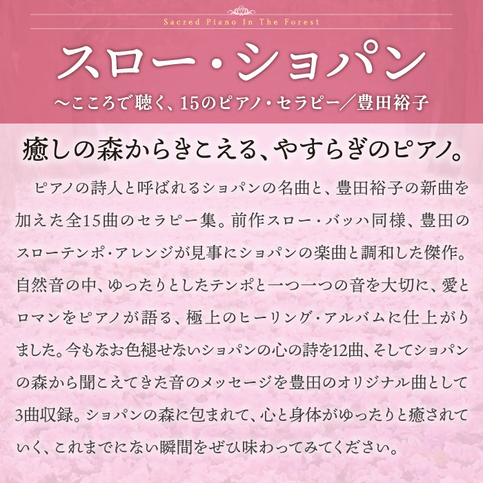 ピアノの詩人と呼ばれるフレデリック・フランソワ・ショパンの名曲と、豊田裕子の新曲を加えた全15曲のセラピー集。