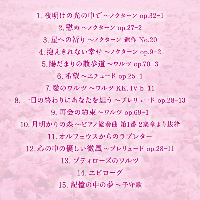 最愛の人を想いながら書いたワルツとノクターン、春の森からインスピレーションを得たロマンス、マヨルカ島の小鳥のさえずりを聞きながら書いたというプレリュード、友人の子供たちとの触れ合いから生まれたという子守歌など、ショパンの心の詩を12曲、そしてショパンの森から聞こえてきた音のメッセージを、豊田のオリジナル曲として3曲収録。