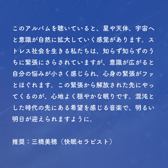 「この作品を聴いていると、星や天体、宇宙へと意識が自然に拡大していく感覚があります。ストレス社会を生きる私たちは、知らず知らずのうちに緊張にさらされていますが、意識が広がると自分の悩みが小さく感じられ、心身の緊張がフッとほぐれます。この緊張から解放された先にやってくるのが、心地よく穏やかな眠りです。混沌とした時代の先にある希望を感じる音楽で、明るい明日が迎えられますように。」