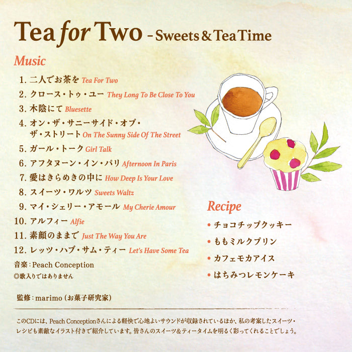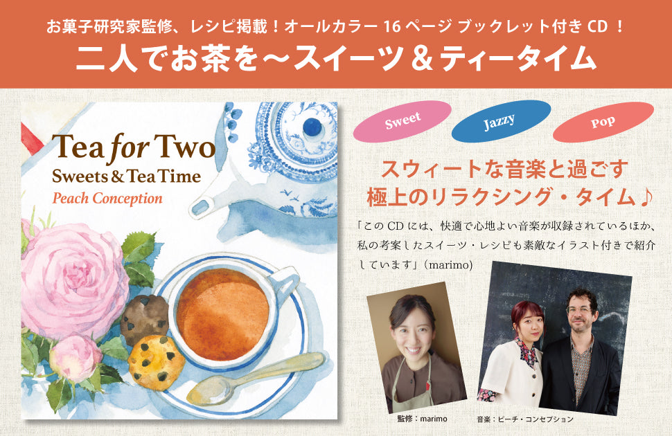 このアルバムは、各方面で活躍中のお菓子研究家、marimoさんを監修に迎え、オリジナル・レシピを紹介いただくとともに、スイーツ&ティータイムに聴きたい音楽を盛り込んだ内容になっています。
