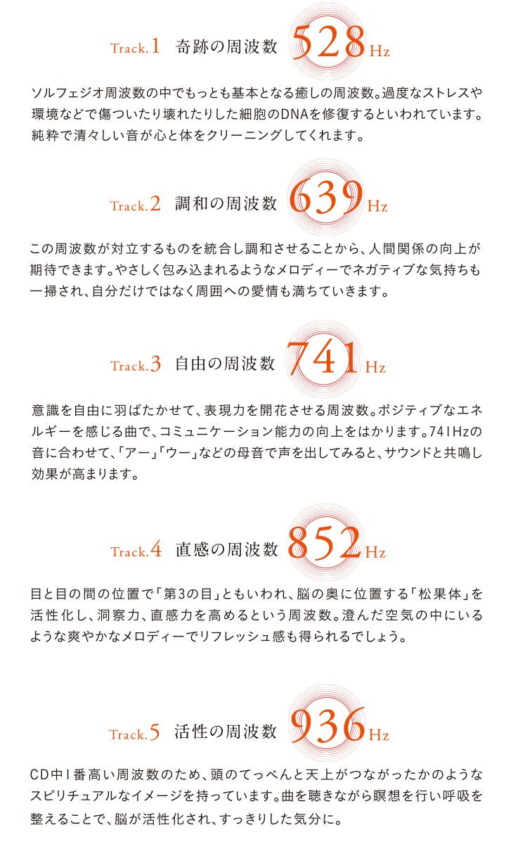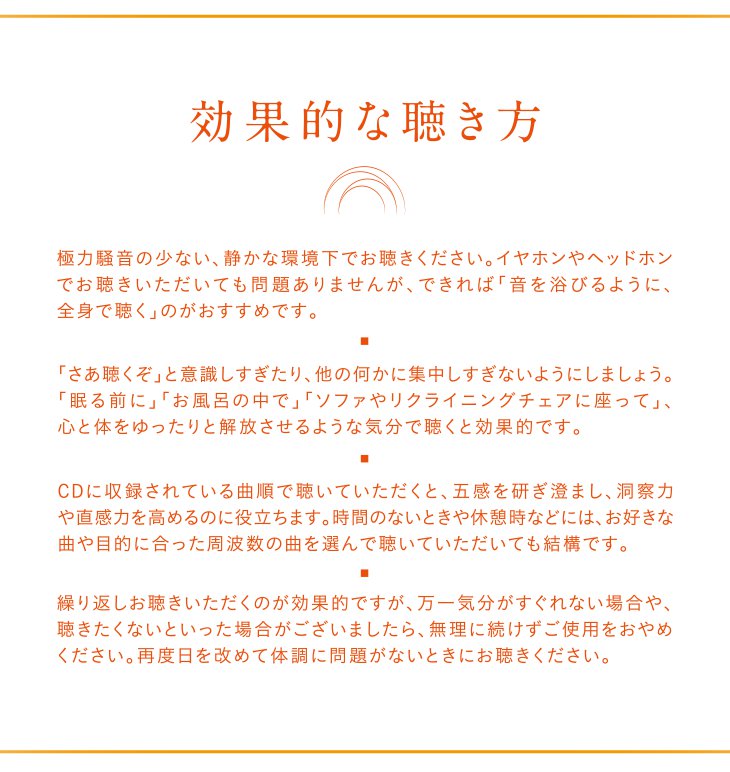 音楽は、各曲の周波数に合わせてチューニングされており、初めての方でも聴きやすく、通常のリラクゼーション・サウンドとしてもお楽しみいただけます。