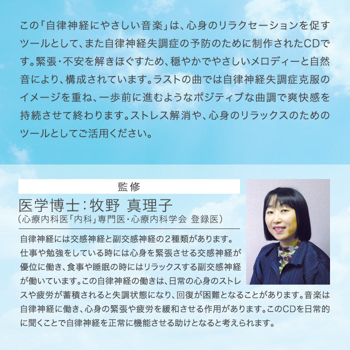 このアルバムは専門医監修のもと、『日々のストレスを解消して自律神経系のバランスをはかり、健康的な生活を送ること』を目的に、爽やかで前向きな気持ちに誘う音楽と自然音で構成されています。
