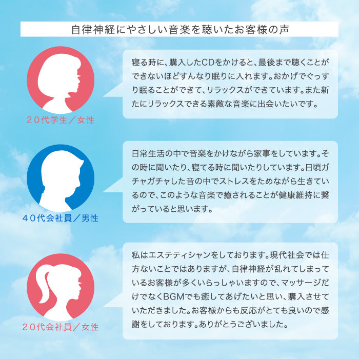 このアルバムを日常的に聴くことで自律神経を正常に機能させる助けとなると考えられます。