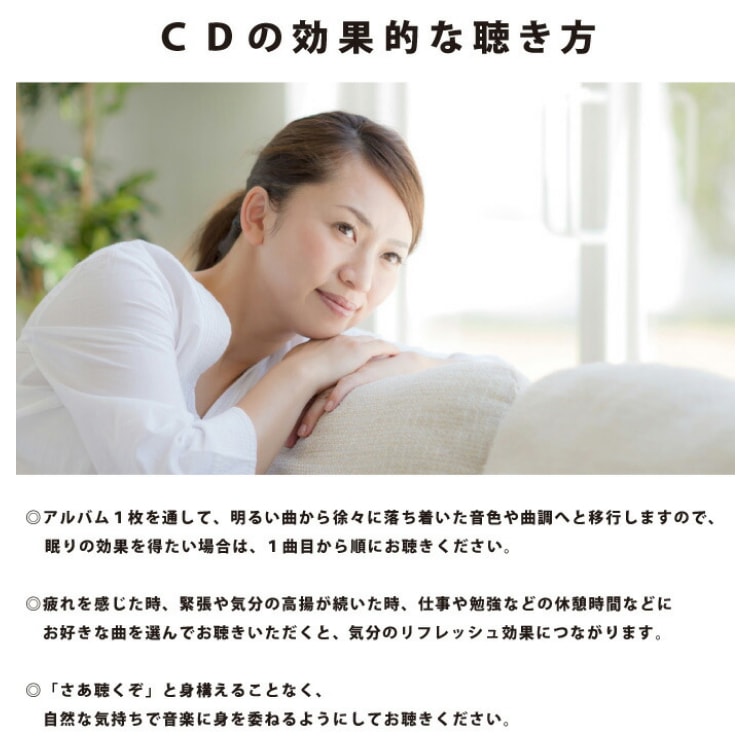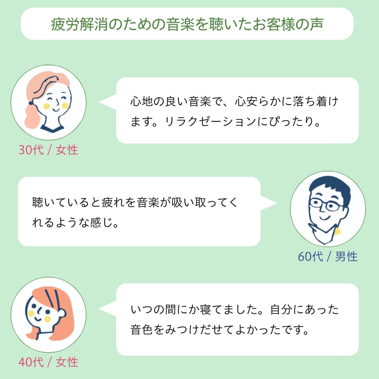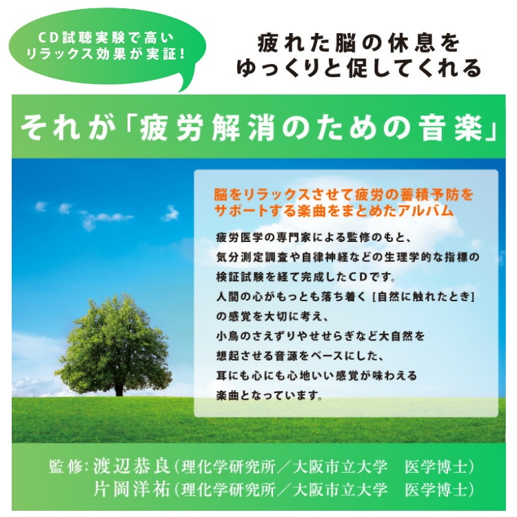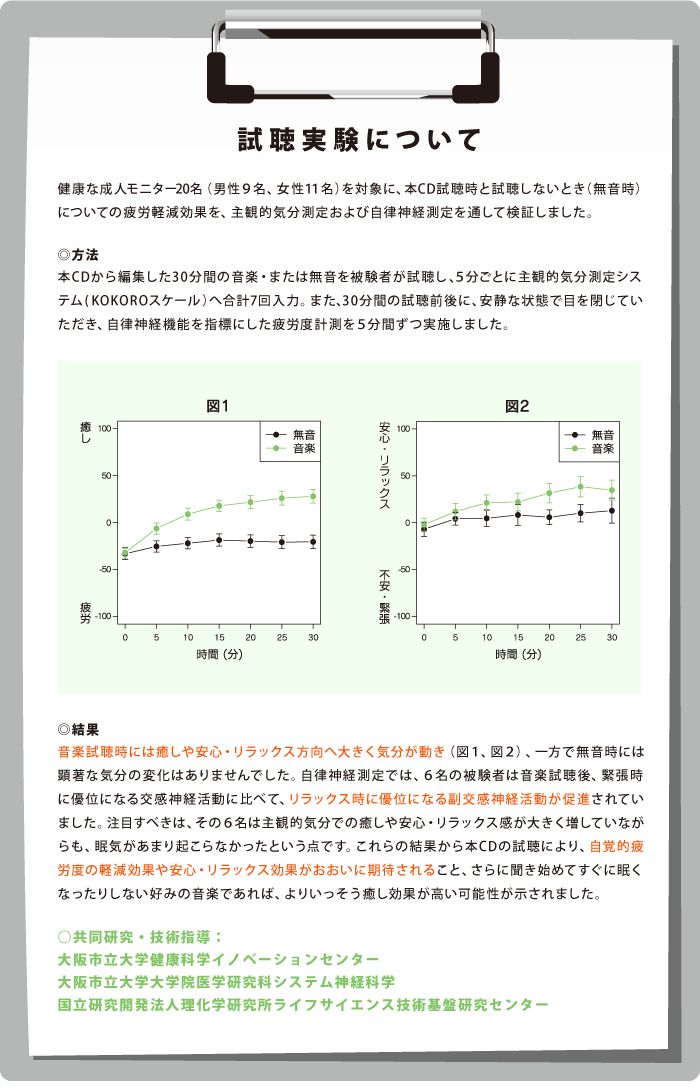 疲労医学の専門家による監修のもと、気分測定調査や自律神経などの生理学的な指標の検証試験を経て制作されており、音楽の「癒し効果・リラックス効果」は実証済み。