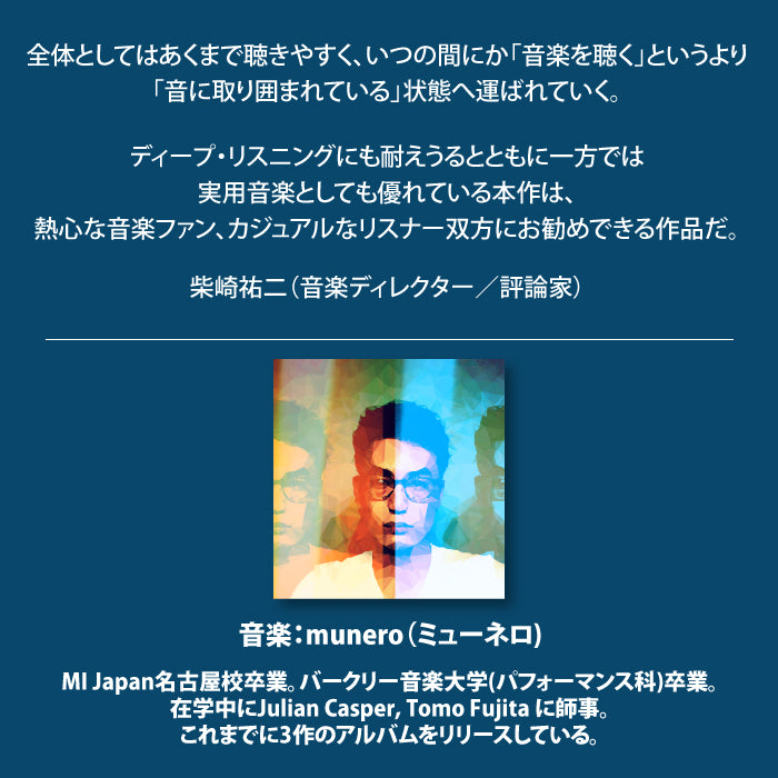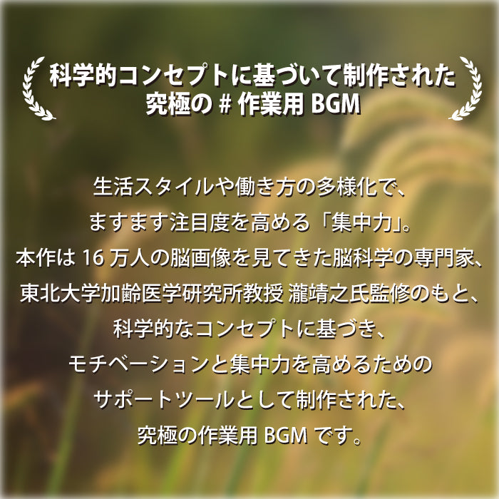本作は16万人の脳画像を見てきた脳科学の専門家、東北大学加齢医学研究所教授 瀧靖之氏監修のもと、科学的なコンセプトに基づき、モチベーションと集中力を高めるためのサポートツールとして制作された、究極の作業用BGMです。