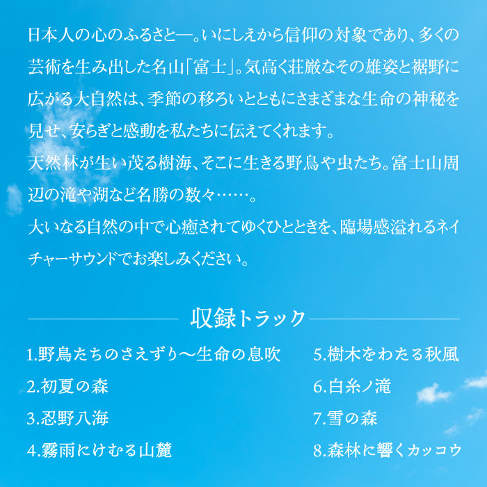 自然音の収録場所は、神秘的な景観の青木ヶ原樹海を含む「富士山麓」を中心に、富士の構成資産の中から「忍野八海」、「白糸ノ滝」や、登山道・林道付近の野鳥のさえずり、豊かに溢れ出る湧水、森に降り注ぐ雨音や秋風の音など、日本の四季の素晴らしさを改めて堪能できる一枚。