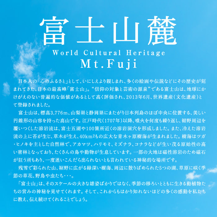 いにしえから信仰の対象であり、多くの芸術を生み出したこの名山は、地球にかけがえのない普遍的な価値があるとして、2013年世界文化遺産として登録されました。