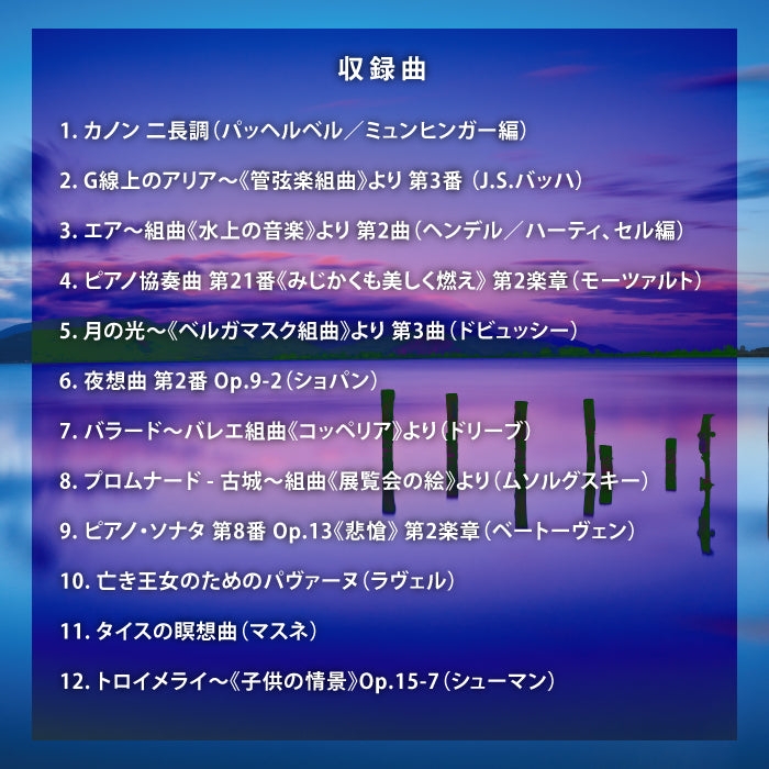 「カノン」「G線上のアリア」「月の光」など聴き覚えのあるメロディー、弦楽器やピアノの優しい調べに耳を澄ませれば、さまざまな雑念から離れて安心感を得られ、心地よい眠りへの準備に心身がシフトすることでしょう。