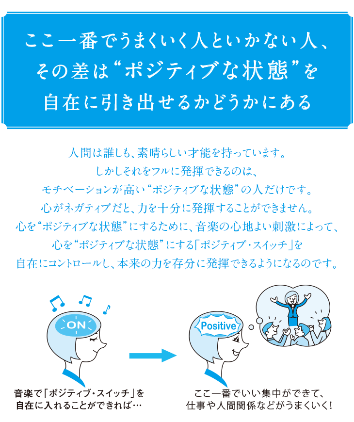 プレッシャーがかかる時や集中したい時、ここぞという時に音楽を聴くと、“ポジティブな状態”を自在に引き出すことができるようになります。