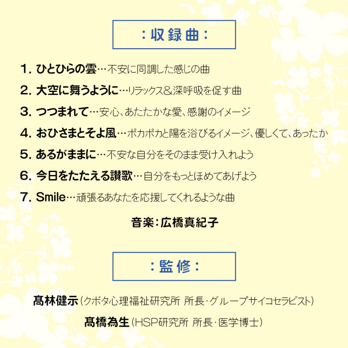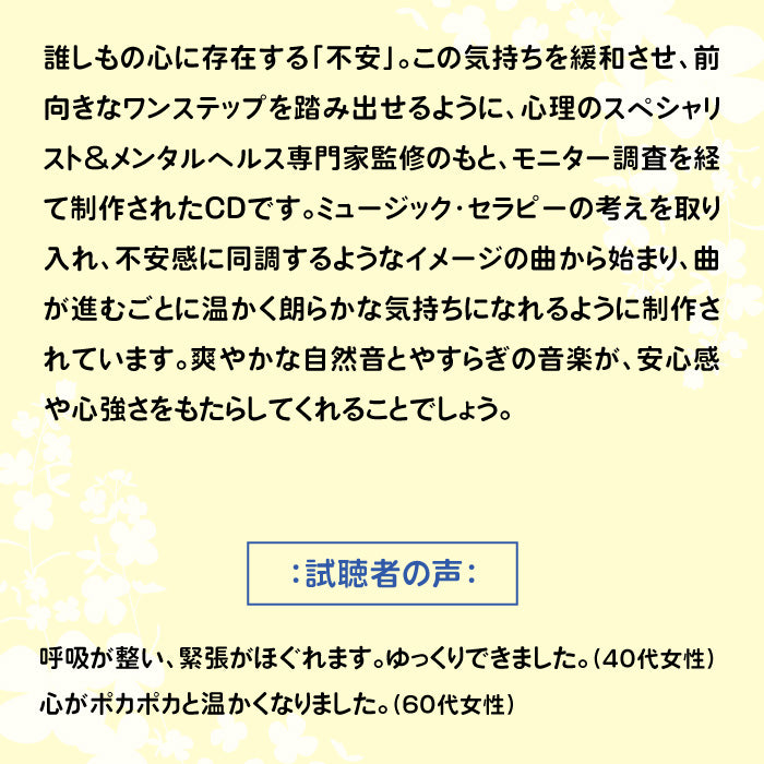 心理のスペシャリストとメンタルヘルスの専門家等の監修のもと、モニター検証を経て制作されたセラピー・ミュージック。