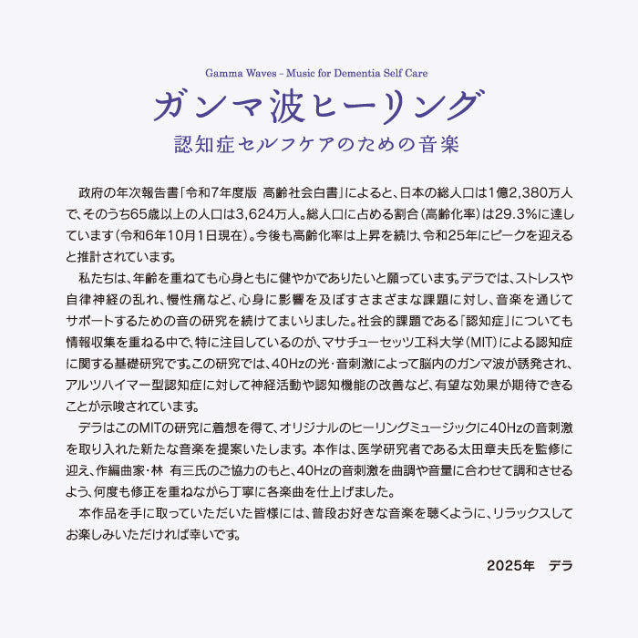 このアルバムは、国内外で話題のガンマ波「40Hzの音刺激」を、オリジナルのヒーリングミュージックに調和させた、認知症セルフケアのための音楽アルバムです。マサチューセッツ工科大学(MIT)をはじめとする認知症に関する基礎成果に着想を得て企画いたしました。