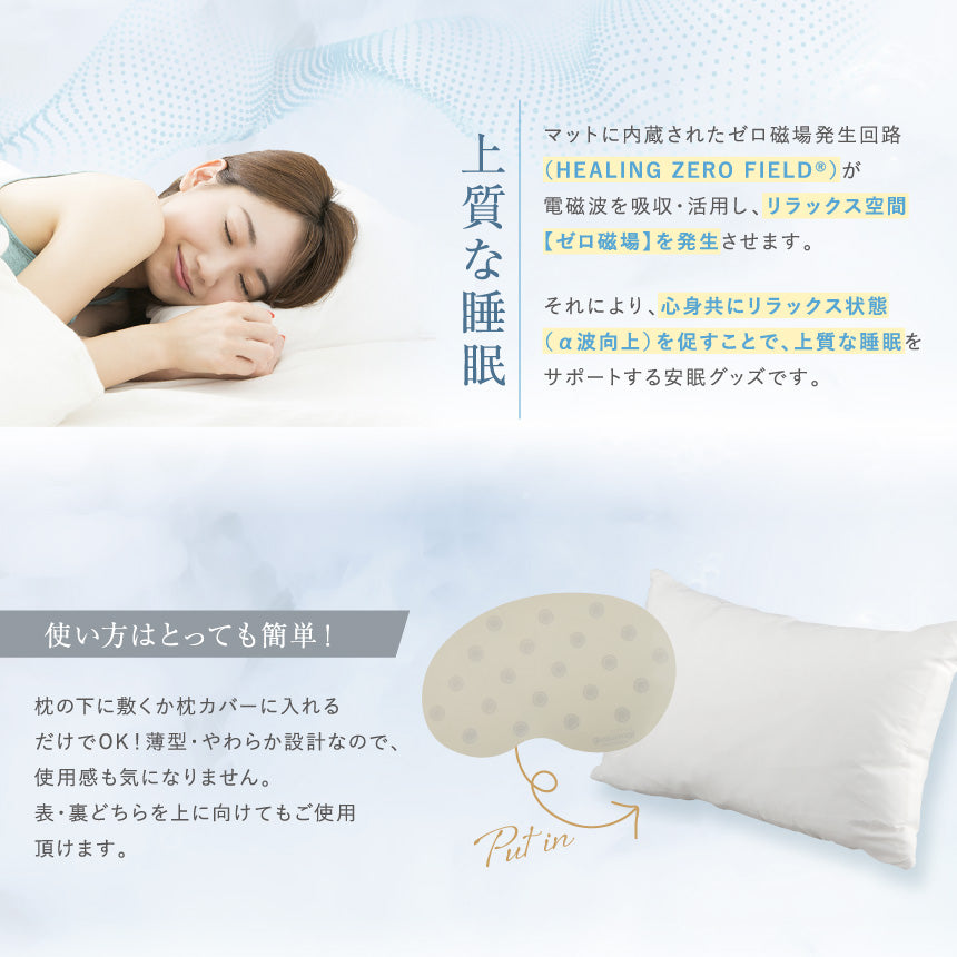 マットに内蔵されたゼロ磁場発生回路(HEALING ZERO FIELD)が、電磁波を吸収・活用し、リラックス空間[ゼロ磁場]を発生させます。