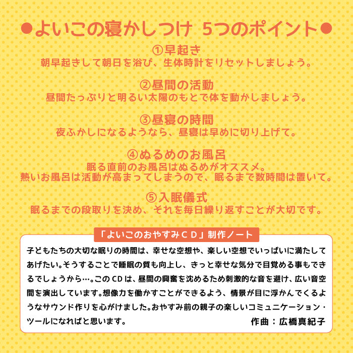 保育関係者や小児科医の先生方の協力のもと制作されたこのアルバムは、ハープやストリングスなどの柔らかく優しい音を使用し、子供に安心感を与えながら徐々に眠りに誘うように構成されています。